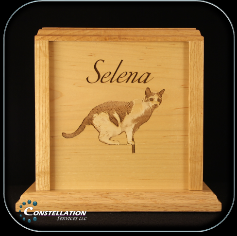 This is why we began offering the Memoria Pet Urn. This oak urn provides a beautiful, durable, and personal enclosure for cremains. As with almost all of our products, we will engrave the facing panel with unlimited text so you can say what you want to say - a poem, a quote, a personal message from you; whatever feels right to you is what we'll do. You also have the option of adding engraving as many of the other faces of the Memoria as you'd like. If you have a favorite photo of your pet, we can convert and engrave most snapshots, and we'll gladly put your pet as you'd like to remember them on your Memoria for an additional fee.